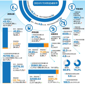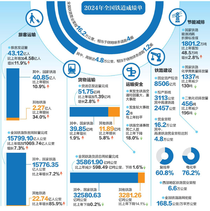 日前,交通运输部官网发布了2024年铁道统计公报。截至去年底,全国铁路营业里程达到16.2万公里,其中,高速铁路营业里程达到4.8万公里。经历了2020年至2022年的连续三年客运低迷期后,2023年铁路客运量增长明显,2024年更实现了客货运量双增长。统计公报显示,2024年,全国铁路旅客发送量完成43.12亿人,比上年增加4.58亿人,增长11.9%。全国铁路货运总发送量完成51.75亿吨,比上年增加1.39亿吨,增长2.8%。
