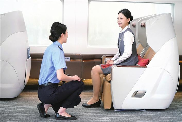 日前,中国铁路哈尔滨局集团有限公司为即将参加2025年暑期旅客运输服务工作的乘务人员开展形体仪态、服务技能以及应急处置等方面的铁路客运服务培训。图为哈尔滨客运段乘务服务专班讲师(右)为乘务人员演示旅客接待标准服务。新华社记者 王 松 摄