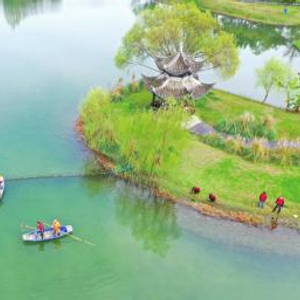 眉山市的志愿者在东坡城市湿地公园清理水面漂浮物、捡拾垃圾。姚永亮 摄(C视觉)