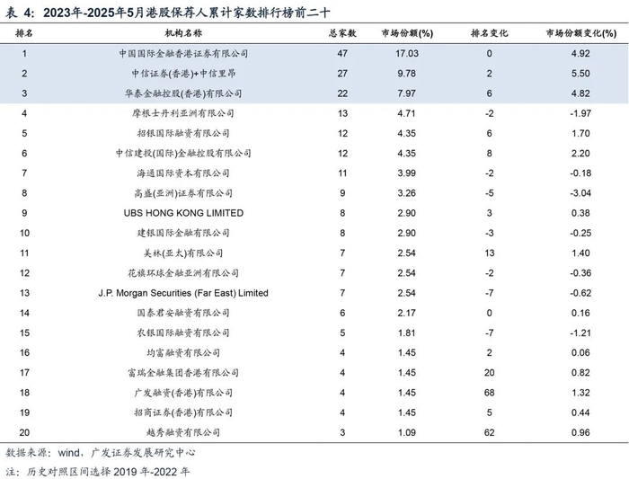 保荐人为中介机构的核心:统计2023年-2025年5月,港股IPO保荐人的竞争格局,中资券商地位明显提升,中金、华泰、中信、国泰海通分别市占17%、9.8%、8%、6.2%。