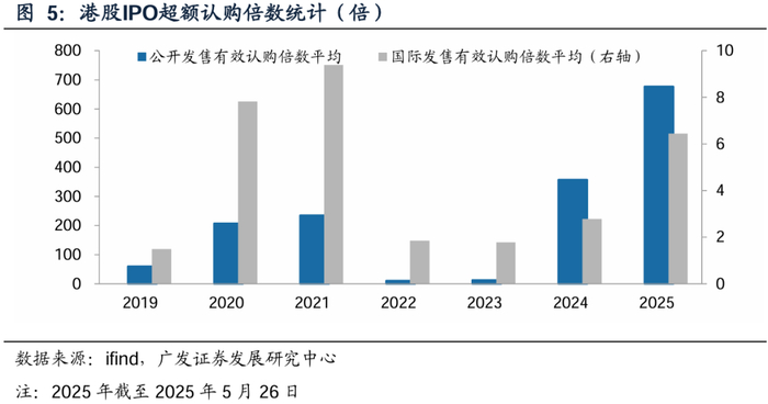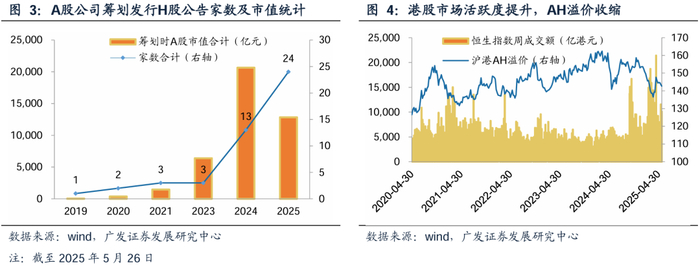 A+H发行有加速趋势。据wind公告统计,2025年截至5月26日,已有24家A股公司发布筹划港股上市提示,已远超24年全年的13家,筹划时A股总市值达到1.28万亿元。当前大部分公司尚处于筹划提示和递表阶段,A股公司的港股发行上市潮预计自2025年下半年更加显著。随着优质内地资产港股上市,有望改善港股市场的流通性,提升港股发展质量。2025年前四个月,港股IPO募资213亿港元,同比+170%。2024年以来IPO认购倍数显著持续增长。新股发行认购活跃,体现出国际资本交易热情,有望激发更多潜在企业的上市意愿。