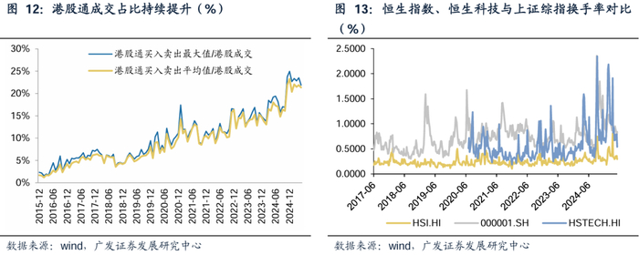 南向资金流入与港股市场换手率提升,均仍有较大空间。南向资金占香港主板成交占比已有2024年初的14%提升至2025年5月的22%,随着南向资金交易热度提升,有望维持港股较高活跃度,港股当前与A股的换手率差距已逐渐缩小,尤其是恒生科技指数的换手率已与上证综指较为接近。当前公募基金配置H股仍有较大空间。据2025年一季报,现存公募基金产品中有3476只明确了港股投资比例,其中披露的港股投资市值占比均与要求上限有较大空间,如要求港股配置比例在股票资产的0%-50%的产品数量最多(3169只)、合计规模最大(2.1万亿元),这类产品目前港股投资市值占股票比重仅22%,远低于50%的上限。公募新规强化业绩基准导向,后续也存在批量更换业绩基准及投资比例要求的可能性,有望进一步催化内地机构资金流入,提升南向资金定价权。
