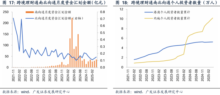 跨境理财通升级释放南向投资需求,券商深度参与。根据央行、中国基金报,跨境理财通1.0版本于2021年启动试点,初期仅允许银行参与,个人投资额度上限为100万元人民币,产品范围限于低风险等级(R1-R3级公募基金),且内地投资者需满足连续5年社保或个税缴纳要求,虽开创了跨境投资新渠道,但受限于客群覆盖窄、产品选择少,市场活跃度始终未能充分释放。2024年2月26日实施的2.0版本则实现多维突破:首次纳入证券公司作为试点主体,个人投资额度从100万元升至300万元,投资者门槛显著优化,内地投资者社保/个税要求从5年降至2年,并新增“近3年年均收入≥40万元”的替代选项,有效扩大合格投资者基数;产品范围同步扩围,“北向通”新增人民币存款及R4级中高风险基金(不含商品期货基金),“南向通”则将中高风险“非复杂”型基金纳入可投范畴,全面激活跨境资产配置需求。同年12月,首批14家券商正式展业。券商展业首月,境内证券公司办理跨境资金汇划9.82亿元,占当月总汇划金额27.06亿元的36%;银行渠道占比64%,中信华南、华泰证券、广发证券客户跨境汇划资金均突破1亿元。截至2024年12月末,南向通投资者占比从年初34%升至62%,成为主力客群。