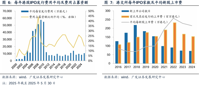 港股上市浪潮直接贡献港股上市费用。IPO涉及保荐人和承销商两大核心角色的协同。统计2023年-2025年5月,港股IPO保荐人的竞争格局,中资券商地位明显提升,中金、华泰、中信、国泰海通分别市占17%、9.8%、8%、6.2%。据wind统计,港股IPO发行费用近四年平均每家为8000万-10000万港元,大头为中介机构的承销佣金。作为独家或联合保荐商一般会额外收取50万美元或30万美元的保荐人费用。