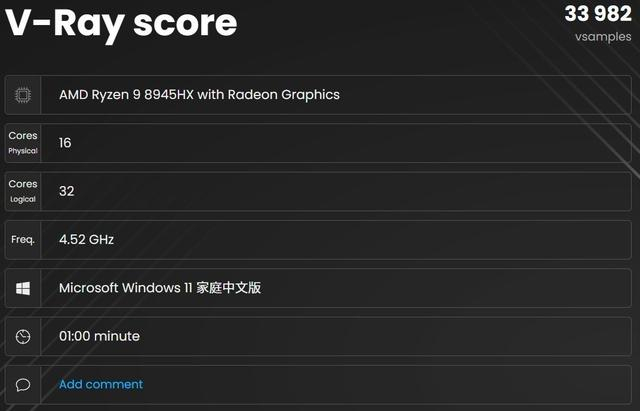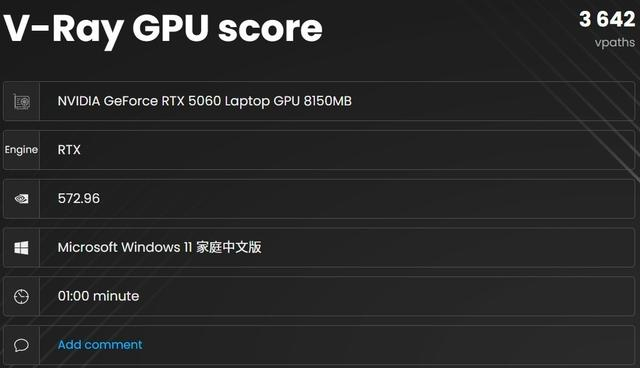 首先是V-Ray渲染,实测锐龙9 8945HX处理器的1分钟渲染采样率高达33982 vsamples,RTX 5060笔记本电脑GPU的CUDA加速性能评分2225,RTX光追性能评分3642,相比RTX 4060笔记本电脑GPU而言都有非常显著的提升。