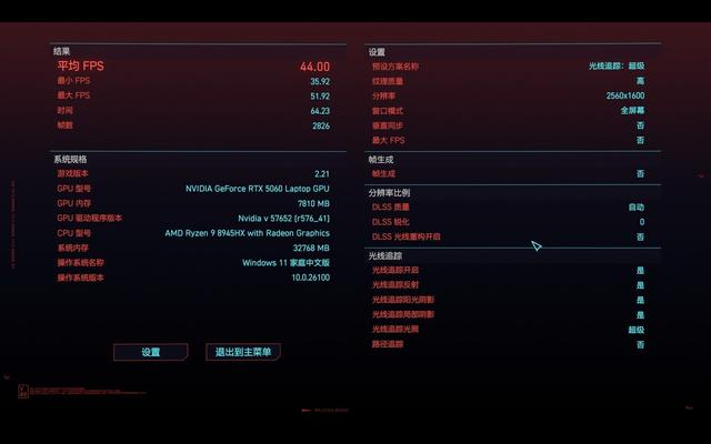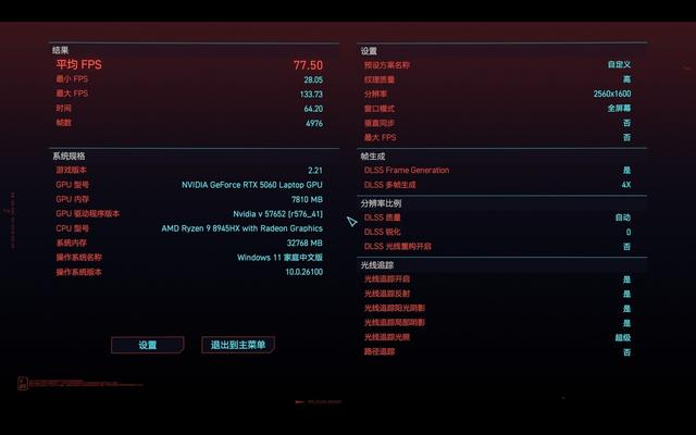 RTX 50系显卡最为核心的技术是DLSS4以及多帧生成,这使得RTX 5060笔记本电脑GPU在运行大型3A游戏更加流畅。首先我们来看看《赛博朋克2077》的测试。