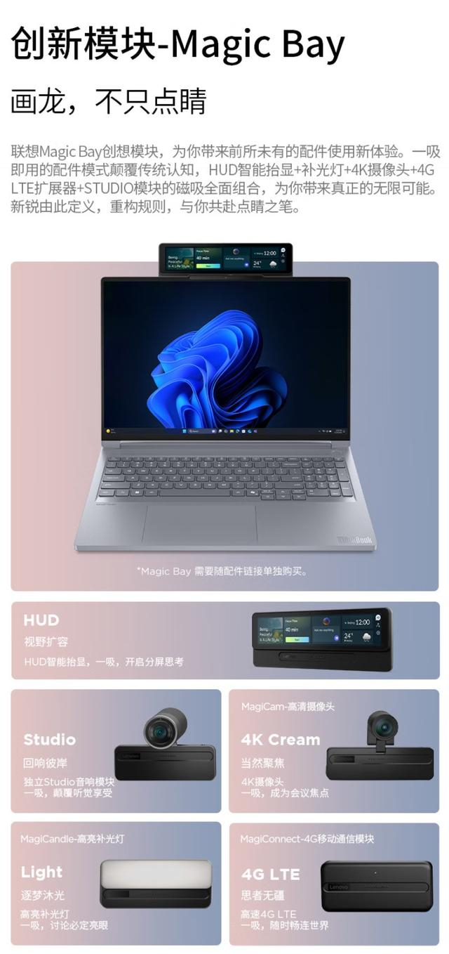 联想ThinkBook 16p 2025 AI元启版还支持Magic Bay创新模块功能。它的摄像头背部面板设计有一排金属触点,通过磁吸方式可以与HUD智能抬显、补光灯、4K摄像头、4G LTE扩展器、STUDIO音响模块快速吸附组合,为用户带来颇具创新性的外设体验。