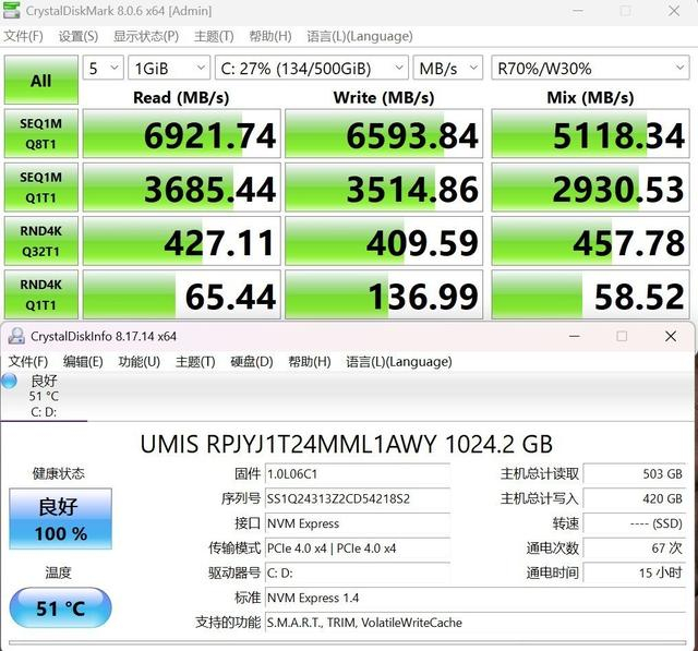 评测产品的固态硬盘选用了一块忆联的1TB PCIe4.0,实测顺序读取速度6921.74MB/s,顺序写入速度6593.84MB/s;4K随机读取速度65.44MB/s,4K随机写入速度136.99MB/s,整体性能达到了高端PCIe 4.0固态硬盘的水准。