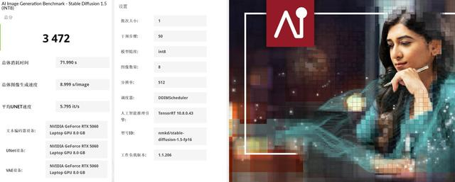 在文生图方面,我们使用UL Procyon的Stable Diffusion INT8进行了测试。单张512分辨率图片平均生成速度为8.999秒,生成8张图总体消耗时间为71.99秒,速度还是相当快的。