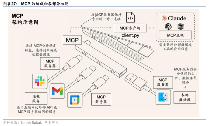 Anthropic提出的MCP为Agent统一了工具调用生态。Anthropic于24年11月发布模型上下文协议(Model Context Protocol,简称MCP)。MCP是一种开放标准,标准化地为大语言模型(LLMs)提供应用场景和数据背景,使开发人员能够在数据源和人工智能工具之间建立安全的双向连接——开发人员可以通过MCP服务器公开数据,也可以构建连接到这些服务器的AI应用程序(MCP客户端)。MCP在开发者和Anthropic的共建下逐步得到认可,OpenAI和Google先后宣布对MCP的兼容和支持,国内阿里、字节、腾讯等大厂也纷纷布局MCP生态。MCP的普及为Agent快速构建和发展提速。
