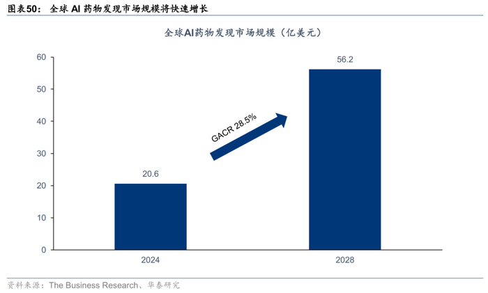 AI正在驱动临床试验范式的系统性变革,AI制药市场规模增长迅速。根据BCG数据,在临床前阶段的药物发现步骤中,AI可以节省至少25%~50%的时间和成本。根据The Business Research Company最新数据,全球AI制药市场规模将从2023年的15.8亿美元增长至2028年的56.2亿美元,年复合增速达28.5%。
