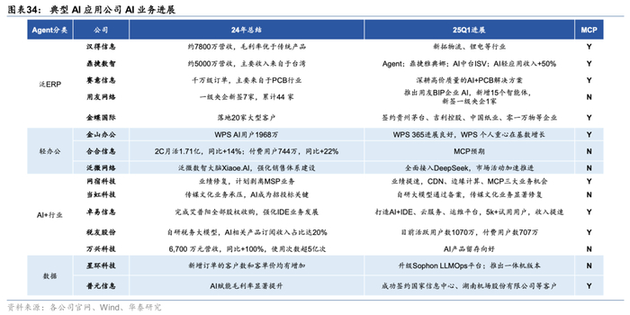 MCP有望加速AI应用产业节奏,应用公司态度积极。MCP协议旨在实现AI应用开发的标准化,对于加速AI应用产业落地具有重要意义。海外Anthropic、OpenAI、Microsoft、Google,国内阿里、腾讯、百度已全面支持MCP,AI应用公司同样快速接入MCP生态。泛ERP类、数据类公司支持MCP,主要是在PaaS平台内提供MCP服务,便于企业开发者打造更丰富的Agent功能;轻办公类、AI+行业类公司支持MCP,主要作为MCP Server提供工具化能力。我们认为,AI应用放量趋势日益明显,产业生态正在加速完善。