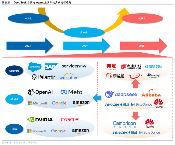 国内Agent快速追赶,全球AI应用共同迈入商业化阶段。1)产品化(2023年):2023年全球软件厂商开始打磨AI应用产品,海外产品进展略领先于国内;2)初步商业化(2024年):海外AI应用逐步实现AI应用成熟度的完善并明确定价模式(订阅+用量),率先进入商业化阶段,国内AI应用加速产品化进展并开始产品标杆试点;3)规模商业化(2025年):受益于国产大模型的能力追赶,国内AI应用加速产品迭代,快速进入商业推广阶段,全球AI应用有望于2025年实现规模化业务放量,看好全球AI应用商业化进展。