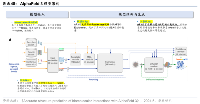 DeepMind AlphaFold持续迭代,革新药物发现范式。AlphaFold系列模型是由Google DeepMind最早于2018年提出的预测蛋白质结构的模型,基于Transformer架构进行构建,而后持续迭代。2021年开源AlphaFold 2,借助该模型,发布了AlphaFold蛋白质结构数据库, 98.5%的人类蛋白质结构全被AlphaFold2预测出来。2024年5月提出AlphaFold 3版本,实现对蛋白质之外的上亿个结构物分子的复合物进行联合结构预测,还可以模拟蛋白质、DNA、RNA和小分子之间的复杂相互作用,而这种能力有望帮助科学家加深对疾病机制和药物相互作用的理解,对药物发现至关重要,使得大模型在医药研发领域的可用性进一步提升。