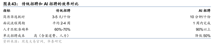 AI时代,具有丰富的HR垂直场景数据、积极布局AI的企业有望获得更多增量机会。面对AI浪潮带来的历史性机遇,领先厂商如美国的Workday、HireVue,以及中国的北森控股、金蝶国际、用友网络等公司均在积极布局AI Agent布局。其中部分公司的AI Agent产品已经快速实现商业化变现:如Workday FY26Q1由AI驱动的订阅收入为20.59亿美元,同比增长13.4%。我们认为,市场份额高、HR垂直场景数据积累丰富、AI布局早的企业有望获得更多增量业务机会。