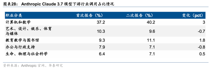 从Anthropic发布的Economic Index看,Coding和教育是Claude模型主要的应用垂类。25年3月,Anthropic基于其Claude 3.7模型,统计了垂类领域的模型调用情况,发现自Claude 3.7 Sonnet推出以来,Coding以及教育、科学的使用份额有所上升。其中Coding在调用量中占有绝对优势,占比高达40%左右。其他调用较多的领域包括艺术/设计/娱乐、办公/行政支持等。