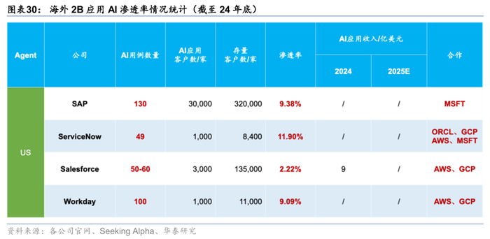 2B应用分行业来看:数据基础好、客户预算足的行业进展较为领先。1)数据基础好:企业私有数据是大模型降低幻觉的重要因素,因此信息化程度高、数据基础好的行业具备更优的AI落地基础;从海外来看,Agent应用下游景气度较高的行业主要包括政府、军事、工业、金融、法律等数字化基础较好的行业;2)客户预算足:客户预算也是影响产品落地节奏的重要因素,大型客户相较中小型客户的AI投资意愿更强,因此大客户占比较高的软件公司AI业务进展也更为领先,以ServiceNow为例,其下游大客户较多,截至24年底,AI产品渗透率已接近12%(存量客户8,000+家,AI应用采购企业数为1,000家左右)。