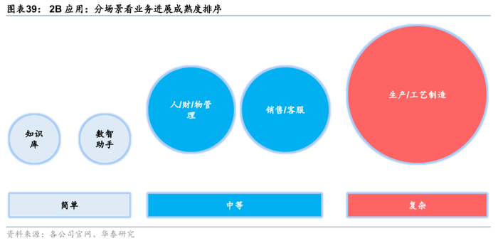 2B应用分场景来看:数据复杂度是影响AI应用落地节奏的关键因素,数据复杂度越低的场景商业化进展越快。1)简单难度梯队:企业知识库、企业高管数智助手率先完成产品落地,主要通过大模型实现企业文件资料与业务系统数据的读取与分析,不涉及跨业务系统的数据双向交互;2)中等难度梯队:企业人/财/物管理Agent、销售/客服Agent或是25年的重点放量环节,此类环节涉及多业务系统的数据交互,同时对于数据分析精准度要求较高,24H2海外应用厂商通过企业数据中台架构搭建了此类Agent的技术基础,有望在25年实现业务放量;3)复杂难度梯队:生产/工艺流程Agent对于精准度要求再度提升,同时涉及数据的实时预测与分析,目前此类应用仍在试点阶段,以Palantir为例,24Q4公司推出的Warp Speed计划,正是以优化工业生产为目标的系列Agent功能,目前仍在验证阶段。