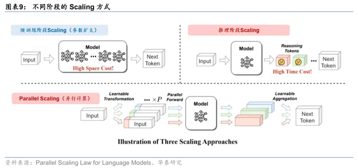 后训练阶段的Scaling Law成为大厂的共识。2024年底,预训练阶段的scaling law的放缓趋势初现,目前在经典Transformer架构基础上的算法优化成为各大厂所追求的方向,从各大厂发布的论文来看,Post-training阶段与Inference阶段的新Scaling路径不断出现,包括模型微调、SFT、RM、PRM、RLHF、RLAIF、CoT、MLA等在内的算法优化不断证明后训练阶段Scaling Law的有效性。同时,Qwen团队提出的Parallel Scaling(并行计算)也进一步拓展了模型的Scaling路径。