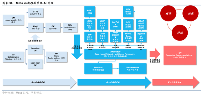 2C应用幻觉容忍度较高,商业化进展或领先于2B。从 AI 落地节奏来看,2C场景(广告、电商、虚拟陪伴等)因幻觉容忍度较高,成为商业化进展较领先的业务场景。以Meta为例,Meta于2024年开始推荐系统与广告系统的AI升级,实现了用户留存时间的增长与广告转化率提升。根据公司25Q1电话会介绍,得益于推荐系统的AI改进,过去半年内Facebook 用户使用时长增加了7%,Instagram 用户使用时长增加了6%,得益于广告系统的AI改进,25Q1 Reels的新的广告推荐模型带动广告转化率提高了5pct。在2B场景,客户场景的复杂度相对较高、对模型输出的精准度要求更高,落地节奏或慢于2C场景。