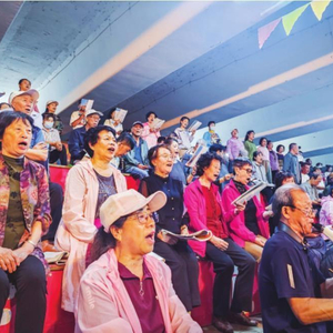 沿步道来到桥下,眼前豁然开朗——标语、彩旗、明亮的灯光,与桥外的环境形成了鲜明的对比。市民们在宽大的木制台阶上梯次坐好,手捧歌词册,身旁放着保温杯,在前排乐队的伴奏下纵情放歌。不少市民加入歌唱队伍,密密匝匝站了数层。