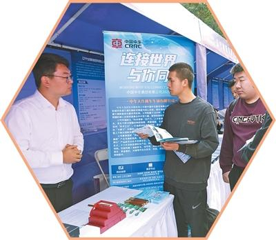 清华大学学生在与用人单位招聘人员(左)交流。
