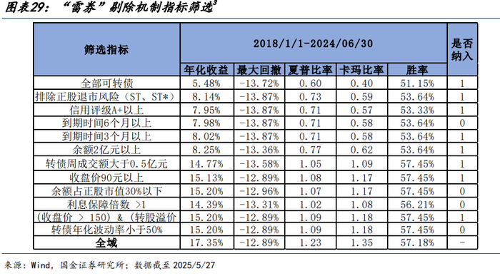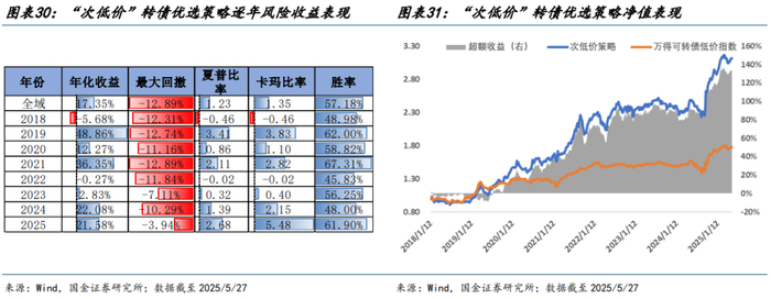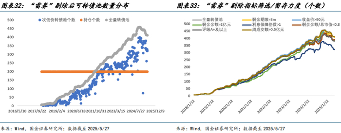 截至 2025/5/27,筛选后样本空间内保留可转债 320 只,持仓转债价格中枢分布在 90 元-120 元之间,次低价策略约于 2022 年 Q1 以后等权持仓价格较低的 200 只转债,此前由于转债数量不满 200 只,故而等权持仓全部通过筛选的转债。从单一条件筛选留存率来看,绝大部分指标约保留了前 97%的优质转债,其中利息保障倍数留存率约为 80%,各指标参数阈值较为合理。