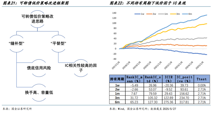 预测及持有周期短,策略换手率较高,低价策略偏短期交易型策略而非配置型策略。低价策略的本质是在满足一定胜率要求的基础上,主要依靠走势反转获得超额收益,收益主要由赔率贡献。机构客户并非中长期看好信用资质更差的低价券,而更类似于中短期博取超跌反弹收益。通过对低价因子与不同预测周期涨跌幅数据回测其相关性发现,在 1周持有周期下,低价策略 ICIR 可达 20%,胜率在 60%以上;随着持有周期增长,不理性的波动信号淡化,资质更优、业绩更优、市场热度更高的“高价策略”收益表现更为占优。同时 1 周左右的持有周期对策略交易换手和策略容量提出较高要求,或可考虑筛选低波转债标的;一方面满足低价策略“绝收收益+低波”的目标,另一方面,可以在损失一定收益的基础上,降低策略换手率、增加策略容量。