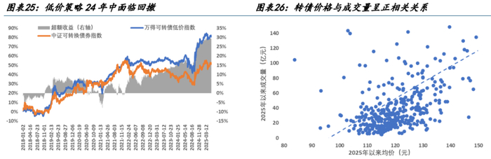 策略资金承载量有限。由于转债投资者以机构为主,其策略承载容量、策略收益表现在实际投资决策中同样重要。对比 2025 年以来转债成交量与均价,两者呈现较为突出的正相关性,低价转债的策略容量显著低于高价部分,同时也侧面印证了上文机构投资者对低价转债信用资质、流动性问题的担心。改进思路上,将“低价”策略试图优化为“次低价”策略,并约束转债余额数据,在满足一定策略容量的基础上,复现低价策略的下行风险较低的特征。