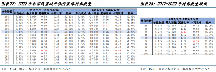 2024 年后需要适度提升持仓数量。为了避免持仓券数不同,对策略容量、策略收益表现造成的扰动,首先回测不同时间区间、不同持仓数量下的策略收益表现。由于 2024 年中可转债首次出现信用冲击问题,故而此前持仓个股约维持50 只左右风险收益表现较优,较为集中的持仓适度放大了低价策略收益弹性。然而,随着“灰犀牛”冲击,为降低策略最大回撤表现、提升策略容量,适度的分散投资是必要滴,以 2024/6/30 为样本内外分界,最优持仓数量保持在 200只左右,基本达到可转债基金持仓数量上限,与万得可转债低价指数样本数量相同。