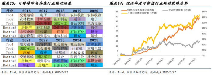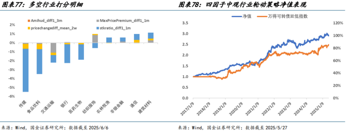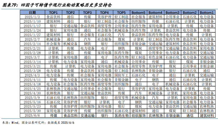 截至 2025/6/6,四因子中观行业轮动策略关注传媒、食品饮料、交通运输、银行、医药生物,呈现多热点分散投资特征,较为符合 2025 年 Q2 主线较为模糊的市场环境,从其打分明细来看,上述五个行业均呈现转股溢价率和可转债价格边际下行特征,估值安全边际进一步提升。同时部分金融地产(非银、)、消费(农林牧渔、纺服)、通信板块估值抬升,故而综合打分性价比处于后序。