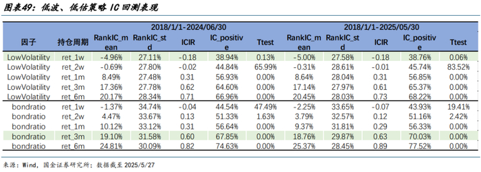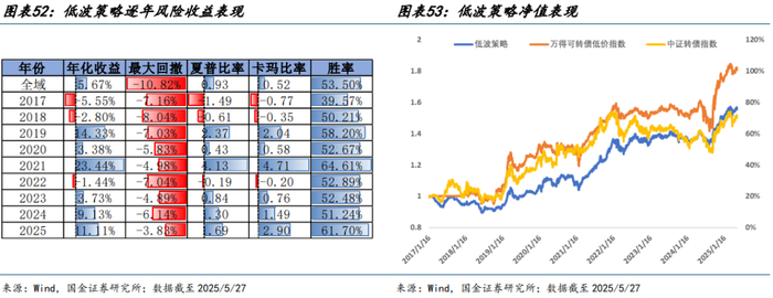 考虑到低价策略定位,二类策略中放弃对超额收益稳定性的考察,核心要求约束净值绝对回撤大小。从分组测试结果来看,低波、低估策略虽然超额中后期有所回撤,但第五组净值表现稳定,可基本满足上述要求。低波策略和低估策略同样具备较优的风险收益表现,对持仓体量较大的头部机构客户来说,不失为良好的子策略。低波可转债标的与绝对收益策略目标具备天然适配性,而低纯债溢价率(bondratio)代表转债的估值水平较低,估值进一步下降可能性较低,有望获益于未来估值回升带来的投资机会。两因子 ICIR 回测表现均在 0.18 以上,胜率维持在 60%以上。