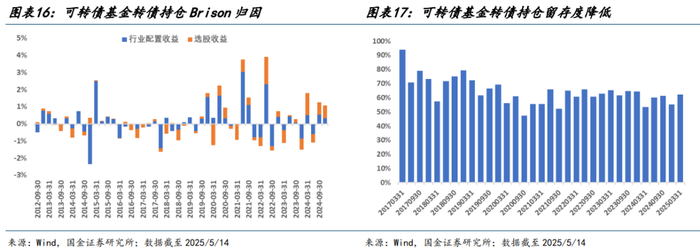上述视角固然更着重于探索策略的理论上限,着眼于可转债的实际投资维度,本文选取了 40 只可转债持仓占比 60%以上的可转债基金,并仅针对其转债仓位进行 Brison 归因2(以中证转债指数为基准),对上文理论结果予以实证。结果显示,虽然在 2024 年行业轮动速度加快背景下,行业选择收益有所缩水,但其在中长周期维度,行业选择收益占比、胜率表现均不次于个券选择。同时可转债基金的季度持仓留存度也呈现一定下行趋势,可侧面论证量化转债或正在逐步成为主流策略之一。