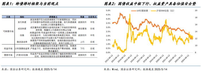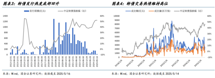 具体来看,十年期国债收益率中长期呈现稳定下行趋势,机构管理人为满足合同收益目标,配置资金由低风险资产向转债迁移是大势所趋;从权益资产来看,沪深 300 指数 PE-TTM 虽从 2024 年 Q4 以来有所回升,但在仍处于近十年估值底部,仍具备充足上行空间。从转债自身来看,作为“上不封顶、下有保底”的凸性资产,其投资价值不仅受到转股溢价率、纯债溢价率等估值定价因素影响,流动性、资金容量等因素同样成为影响投资者决策的重要因素之一,转债或已逐步从“小众创新型”资产逐步转变为共识的稀缺型配置资产。中证转债指数收益走势与转债市场发行规模、成交规模呈现显著正相关关系,转债走牛固然会刺激上市公司融资需求,而转债市场进一步扩容同样吸引了体量更大资方,进而形成正向循环。从转债估值水平来看,其收益走势与平底溢价率、纯债溢价率、隐含波动率呈现较高一致性。2024 年 Q4 以来其发行热度、估值水平和期权价值稳步回升,但距离 2021 年高点溢价率仍具备 20%潜在上行空间。综上,从转债市场、债券市场、权益市场三个角度综合评估,对当前转债资产投资价值保持中性偏乐观态度。