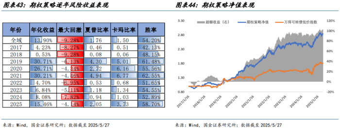 低估策略在满足风险收益基本不变的情况下,提高 2%的年化回报。2017 年以来期权策略年化收益近 11%,最大回撤约12%,夏普比率约 1.5,且 2018 年以来逐年收益均实现正收益。低估策略相较于低价策略,年化收益提升 2%,超额回撤维持不变,夏普和卡玛比率均有所提升。