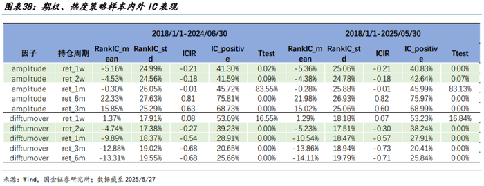 结合上文,从期权、热度策略 IC 和分组测试收益表现来看,中短周期持仓收益表现更优,且换手率和策略容量基本满足机构客户诉求,故而后文以周度策略为例,展示策略特征。五因子样本内外 IC 表现较为稳定,单因子 ICIR 均在0.18 以上,除低价因子外单因子胜率均在 62%以上,复合因子 ICIR 为 36.7%,胜率为 67%。