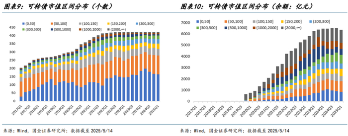 随着 2017 年以来可转债市场的数量和规模快速提升,增加了量化选转债的必要性和重要性。2017 年 2 月证监会对定增的发行规模限制,定增收紧使得可转债作为替代方案,迎来黄金发展阶段,市场余额一度逼近 9000 亿市值。受 2023年 8 月证监会提高上市公司再融资要求影响,转债的审批和发行节奏明显放缓,转债供给端再度收紧。截至 2025/5/14,转债市场数量下行至 492 只,市场余额下降至 6864 亿元。