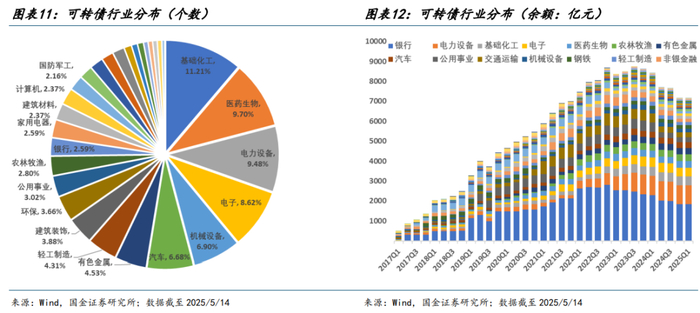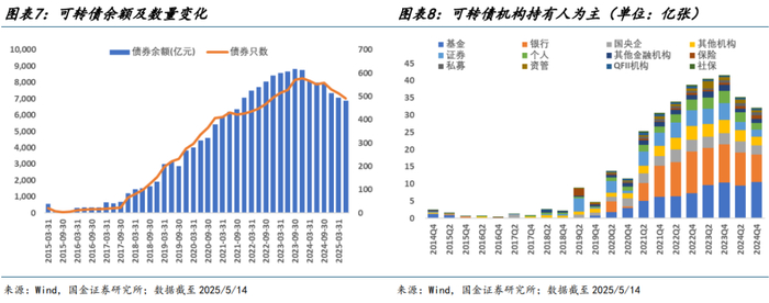 转债投资者结构方面,机构投资者占主导地位。根据 2015 年以来可转债半年度前十大持有人统计数据,我国可转债市场的投资者结构相对多元且较为稳定,机构投资者占比达90%以上,其中以公募基金和银行为主题,其占比均超20%。从时序变化来看,受权益市场影响,虽然 2022 年以来公募基金(公募+专户)持仓规模增幅趋缓,但难掩其占比波动上升趋势并于 2024 年底突破 30%占比。