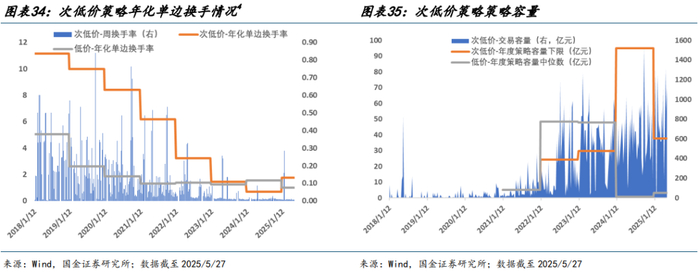 次低价策略不仅提升策略表现、降低最大回撤,且实现策略容量提升。从策略容量和换手数据来看,随着可转债持仓扩容,次低价策略持仓数量上升,策略换手呈现稳步下降趋势,2023 年以后策略换手维持在年化单边 1.8 倍以下,与低价策略换手率相近,基本满足机构持有人换手诉求。策略容量维度,统计策略持仓标的每周第一个交易日的最大可交易金额,再根据换仓权重反推各个标的对于策略容量上限约束。分别统计次低价策略的持仓容量下限(即所有持仓均需在一天内换仓完毕),以及传统低价策略容量中位数(即满足一般持仓券需在当天换仓完毕),结果显示次低价策略 2022 年后容量稳定在 25 亿元以上,而低价策略绝大部分日期策略容量在 5 亿元以下。通过对标的池的有效约束,次低价策略实现对传统低价策略的有效改进,基本满足机构客户持仓体量诉求。