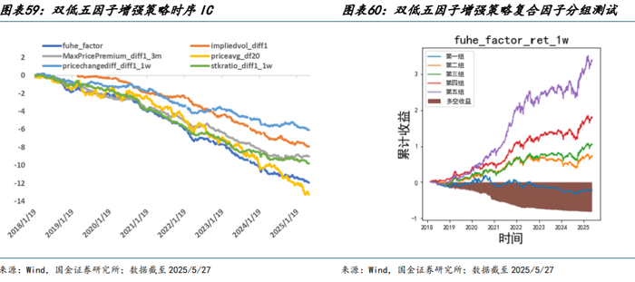 期权策略不仅是对低价策略改进,相对次低价策略投资性价比更优。考虑到热度策略在 2022 年以来,股熊债牛的市场环境下超额表现略逊色于期权策略,且绝对收益稳定性较差,故而首推期权策略。从两因子 IC 及分组结果来看,期权+热度策略样本内外 ICIR 均在在 18%,IC 胜率 60%左右,超额收益稳定。2017 年以来期权策略年化收益近 14%,最大回撤小于 10%,夏普和卡玛比率均在 1.5 以上。期权策略相较于低价策略,超额回测降低 3%,年化收益增加 4%,夏普和卡玛比率提升 0.7 左右,整体提升明显。