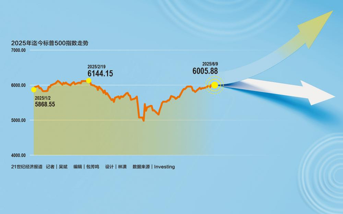 当地时间6月9日,标普500指数继续走高,收于6005.88点,进一步逼近历史高点,距离2月份创下的历史最高收盘点位仅差约2%。自4月8日美股因关税担忧而触及阶段低点以来,标普500指数已反弹逾20%。