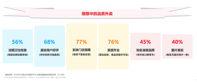 从消费金额看,62% 的消费者单人餐标准集中在 20~40 元区间,构成市场主流价格带。超四成消费者计划增加外卖支出,82%的增支用户将“选择更高品质餐食”列为首要因素,反映出外卖消费呈现显著的品质升级趋势。外卖消费者正自发形成对品质外卖的追求,该追求已从被动规避风险转向主动构建筛选体系,形成多维的品质评估框架。消费者将 “拥有实体门店”列为品质外卖的首要标准,折射出对“幽灵厨房”的深层担忧;其次是对“资质齐全”的要求,凸显食品安全意识的全面觉醒。在基础门槛之上,消费者进一步提出品质体验升级诉求:期待真实透明的评价体系、要求后厨卫生定期公示,体现对“可见可控”消费环境的渴望;而对知名连锁品牌的偏好、对“图片与实物一致”的执着,则表明标准化与信任感仍是市场稀缺资源。