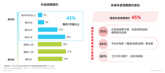 艾瑞调研数据显示,消费者外卖消费频次在每天1次及以上的比例占43%,已近半数。 同时45%的消费者未来会增加外卖消费频次,外卖品类的日益丰富、平台的大力补贴以及消费者自身有限的时间精力,共同推动外卖消费频次的增加,促使外卖消费深度融入都市生活。