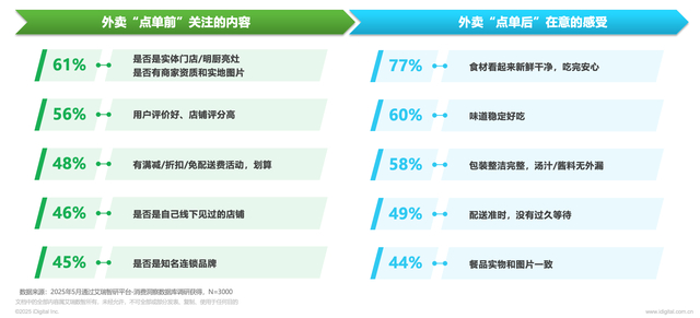 在互联网信息的快速传播下,外卖行业也有食品安全问题、配送争议等行业乱象,让消费者对外卖卫生、健康等问题产生担忧。然而,这不仅未能阻挡消费者对外卖的热爱,反而促使他们更加主动地追求品质外卖。艾瑞调研数据显示,在点单前,消费者会综合考量诸多因素,仔细查看商家是否有实体门店、明厨亮灶以及商家资质、实地照片,并参考真实用户的评价和店铺评分。点单后,他们还会关注食材的新鲜程度、味道以及包装,力求物有所值。