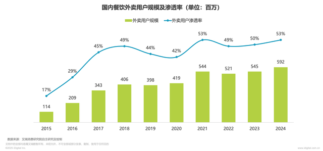 随着数字经济快速发展、城市化进程加速以及消费者生活方式的转变,外卖已深度融入日常生活,成为餐饮行业的重要增长引擎。截至2024年12月,我国网上外卖用户规模达5.92亿人,较2023年12月增长4777万人,占网民整体的53%。这一数据表明,外卖服务已成为超半数中国网民日常生活的刚性需求。