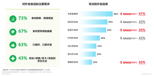 调研显示:外卖进一步高频化,20%的用户每日点外卖高达4次及以上,有七成消费者在点外卖时会产生“品质焦虑”,其中卫生、口感、健康成为三大核心焦虑点,因此更多消费者将“拥有实体门店”列为点外卖的首要标准,会关注明厨亮灶以及商家资质、实地照片。消费者在外卖选择上更加注重餐食的营养搭配和品质健康,在点单后会更加关注食材的新鲜程度、味道以及包装,力求获得品质餐品。有46%的用户表示,未来会增加外卖支出,69%的用户称后续会点更高品质的餐食,如有机、轻食、品牌店等品质外卖。