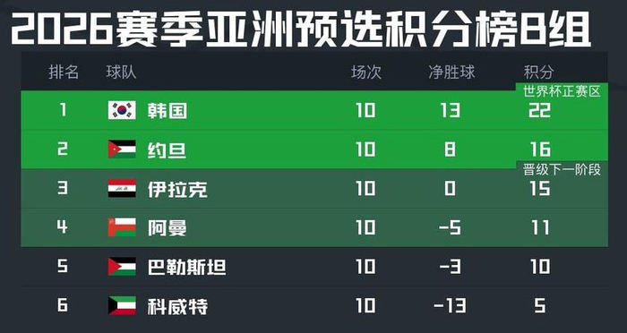 B组的韩国队和约旦队此前已经提前晋级世界杯决赛圈,伊拉克队在末轮击败约旦队之后确保了附加赛资格,阿曼队在少打一人的情况下补时点球绝平巴勒斯坦队之后也惊险进入附加赛,巴勒斯坦队则错失好局和科威特队一同惨遭淘汰。
