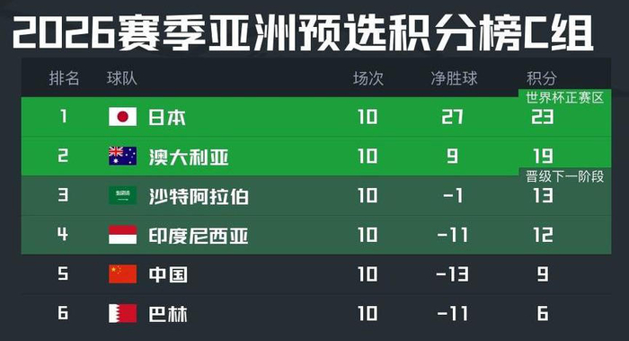 C组的澳大利亚队在末轮击败沙特阿拉伯队之后和日本队携手晋级世界杯决赛圈,沙特阿拉伯队则只能和印度尼西亚队一同参加附加赛,中国队和巴林队则早已提前出局。