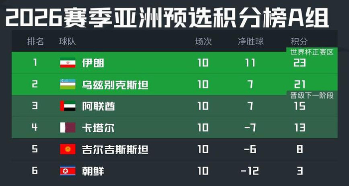 A组的悬念在第9轮比赛过后就已经全部终结,伊朗队和乌兹别克斯坦队成功晋级世界杯决赛圈,阿联酋队和卡塔尔队进入附加赛,吉尔吉斯斯坦队和朝鲜队则被淘汰出局。
