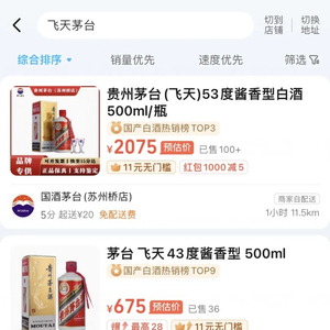 飞天茅台批价下滑至2000元/瓶所产生的涟漪也同步影响到经销商与终端市场的情绪。小编走访北京部分终端市场发现,目前53度飞天茅台在烟酒店内售价约2100—2300元/瓶。安贞附近烟酒店店员表示:“53度飞天茅台目前售价2150元/瓶。如果不着急用酒,可以等到7月中旬入手。以往年来看,8月之后会出现小幅上升为中秋节、国庆节做准备。”除终端市场价格外,目前在饿了么App上,53度飞天茅台售价多集中于2000—2100元/瓶。